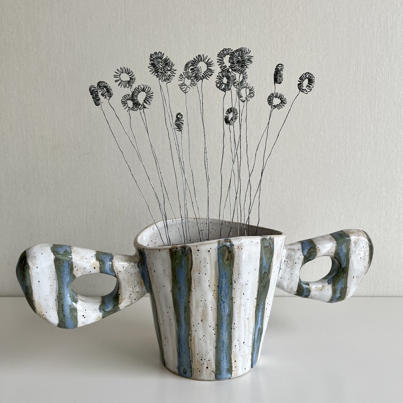 Cheeky Pot/Vase är en unik handgjord kruka som också fungerar som vas i keramik. Krukan är glaserad i ränder med blågrön och vit glasyr.