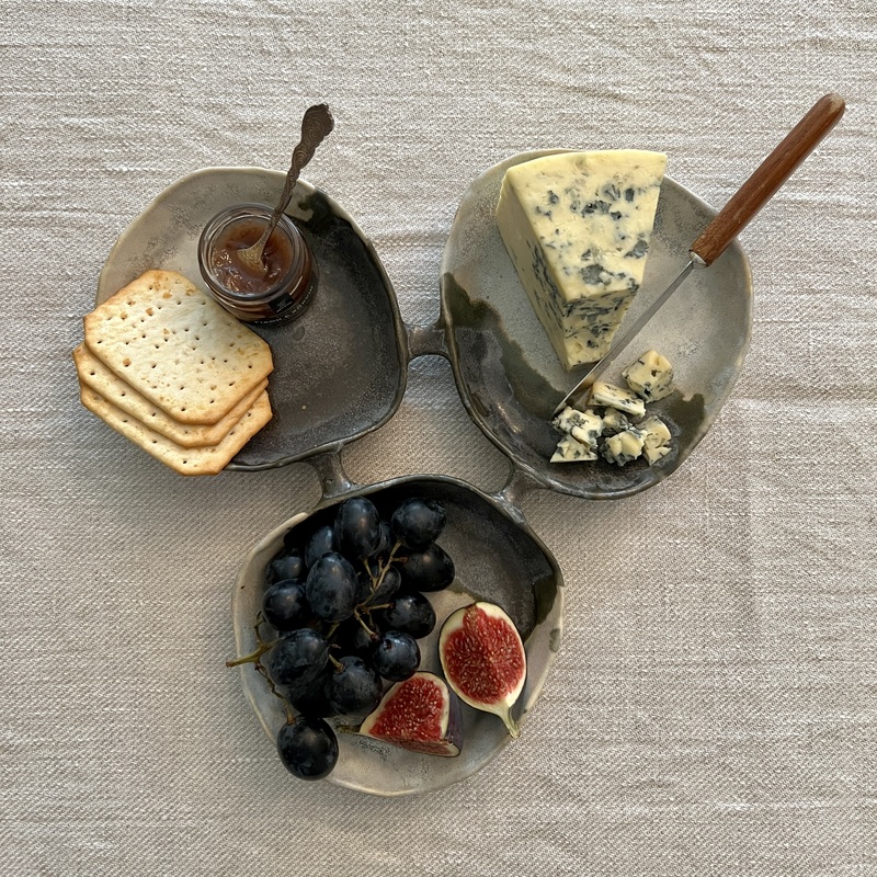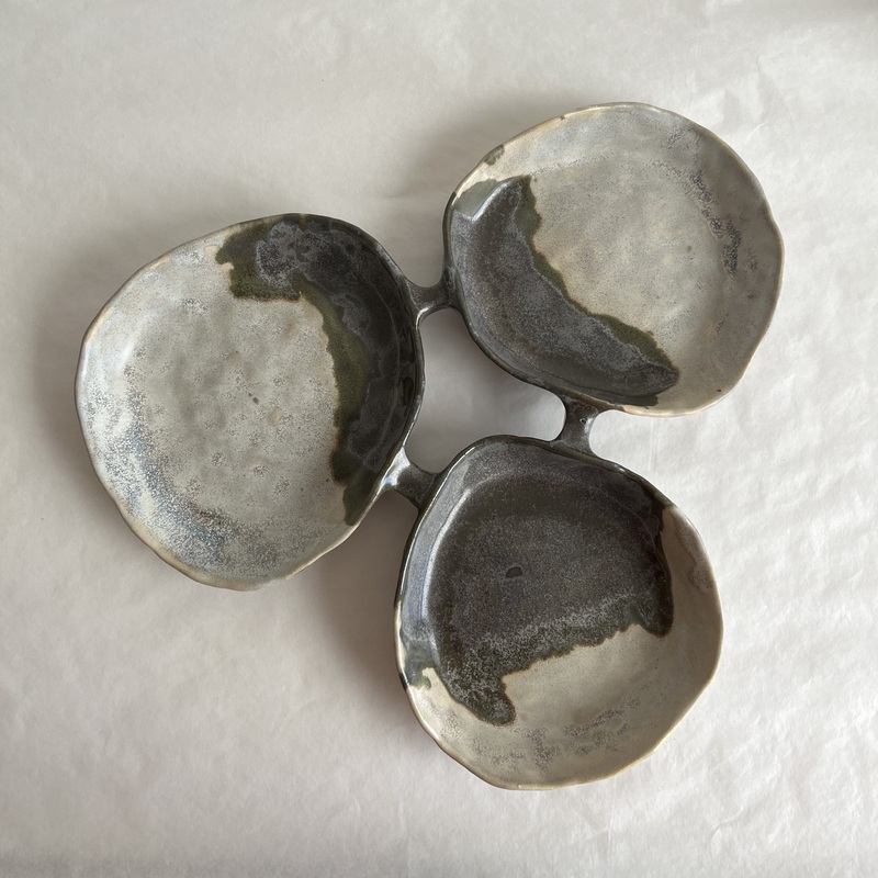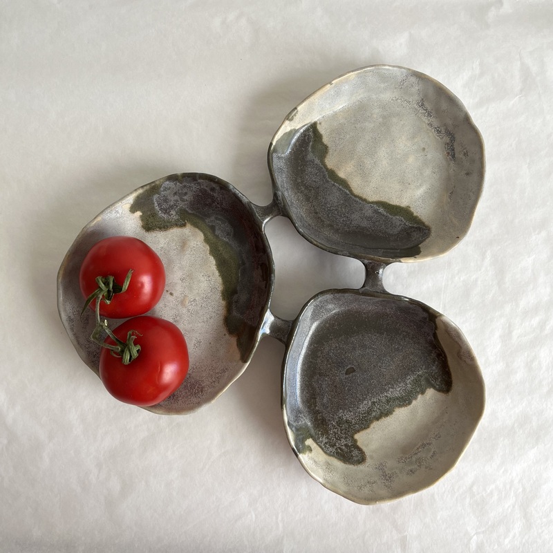 Ett handgjort serveringsfat i keramik i formen av tre ihopsatta skålar. Fatet kan användas för servering av tilltugg till drinken, ost, olika tillbehör till maten, för att lägga smycken eller andra småsaker i. Fatet är skapat vit stengodslera och glaserat med glasyrerna skiffergrå och granit grå glasyr.